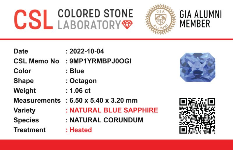 The sapphire has been professionally tested and certified by Colored Stone Laboratory (CSL), ensuring its authenticity and gemological characteristics.
