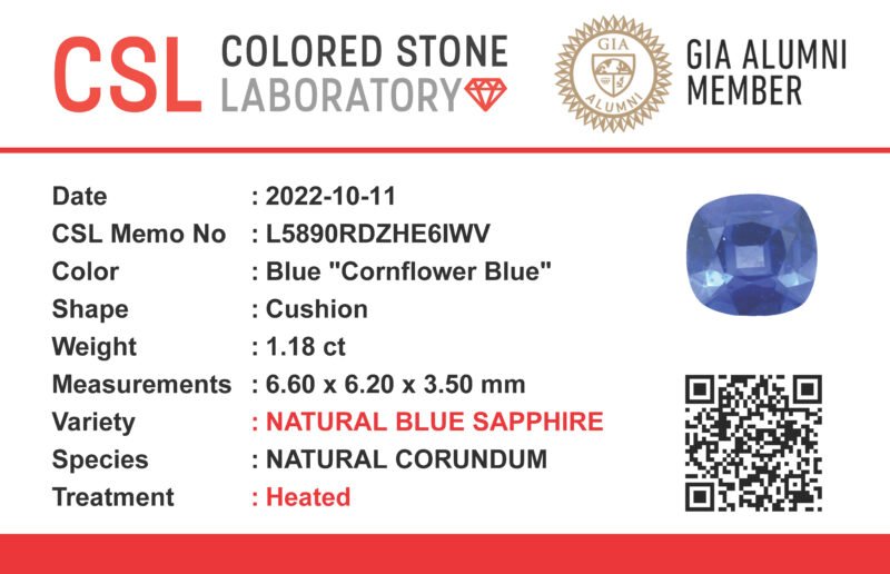 The sapphire has been professionally tested and certified by Colored Stone Laboratory (CSL), ensuring its authenticity and gemological characteristics.