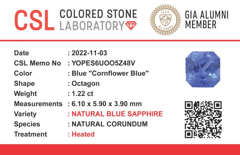 The sapphire has been professionally tested and certified by Colored Stone Laboratory (CSL), ensuring its authenticity and gemological characteristics.