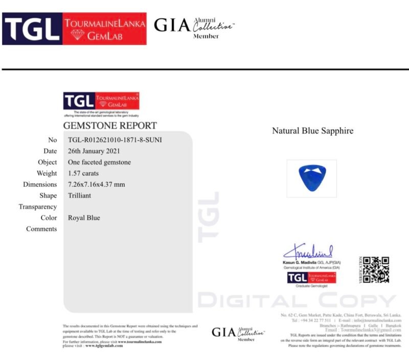 The sapphire has been professionally tested and certified by TourmalineLanka GemLab (TGL) ensuring its authenticity and gemological characteristics.